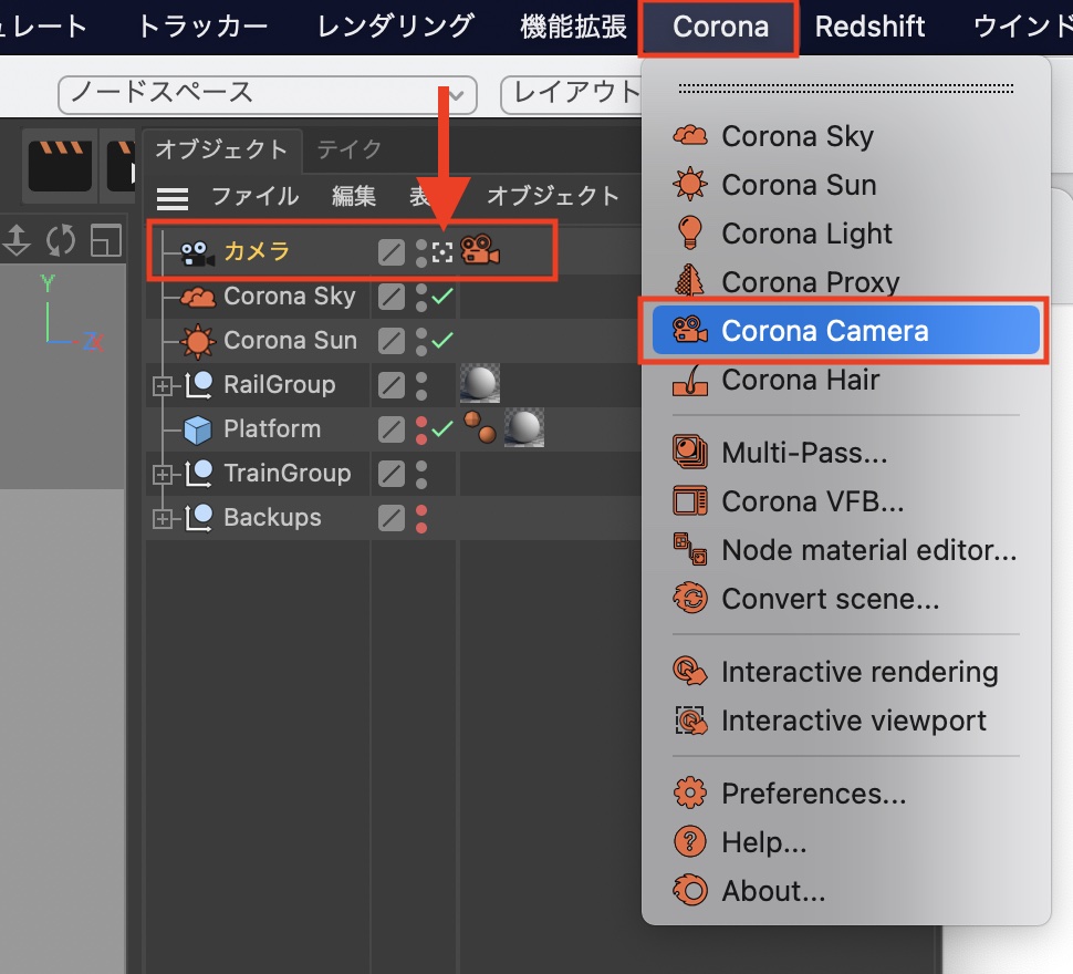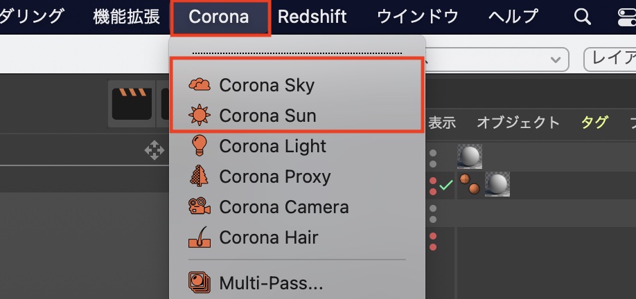 Corona SunとCorona Skyの追加方法は上部メニューにある「Corona」の項目から2つのオブジェクトを追加します。