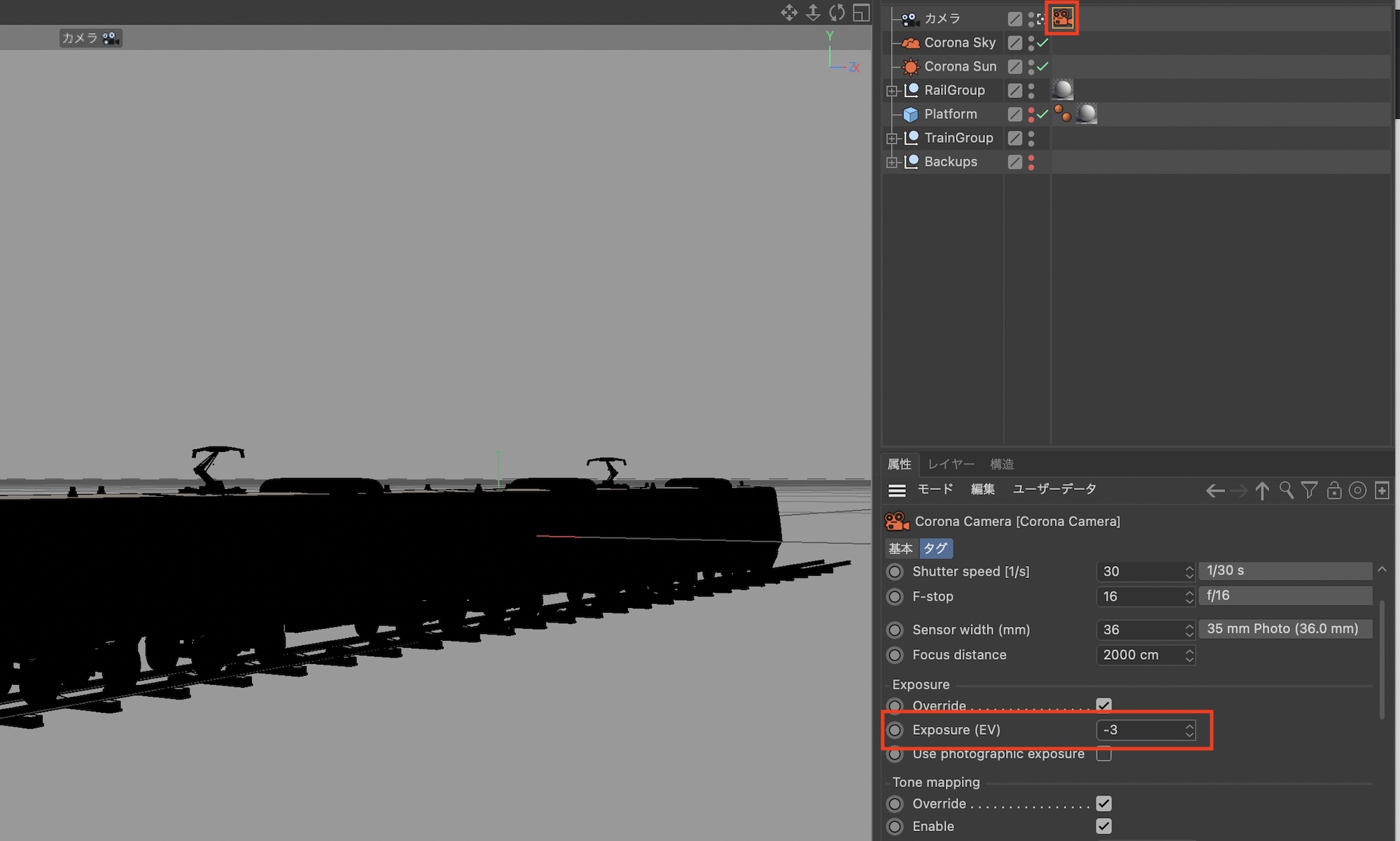 Corona Cameraのタグを選択し、「Exposure(EV)」の数値を「-3」に指定します。
