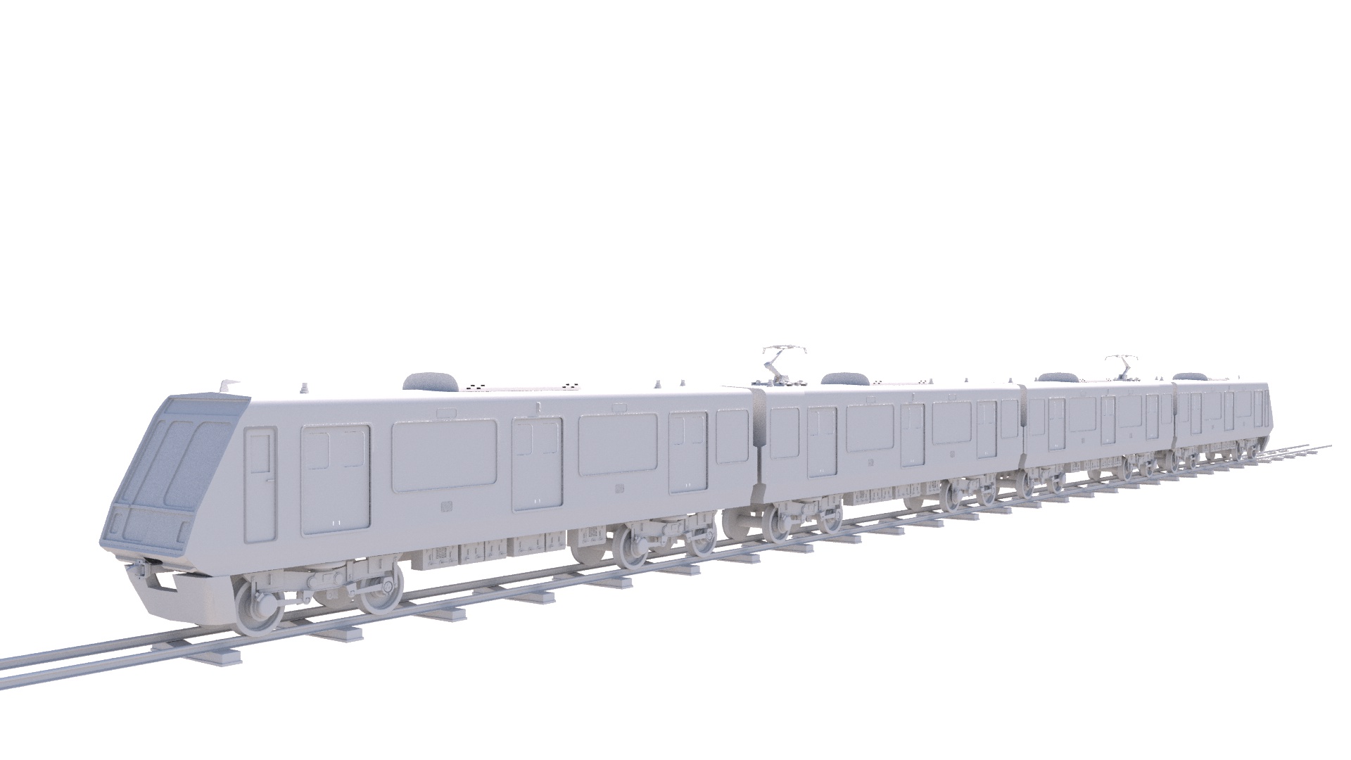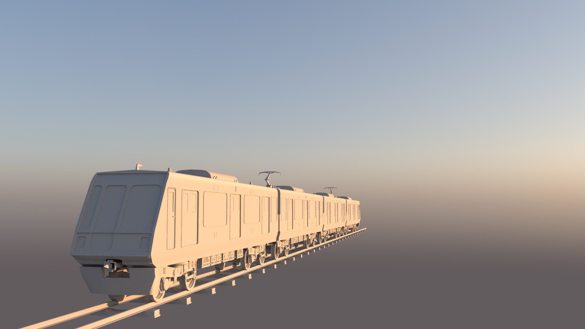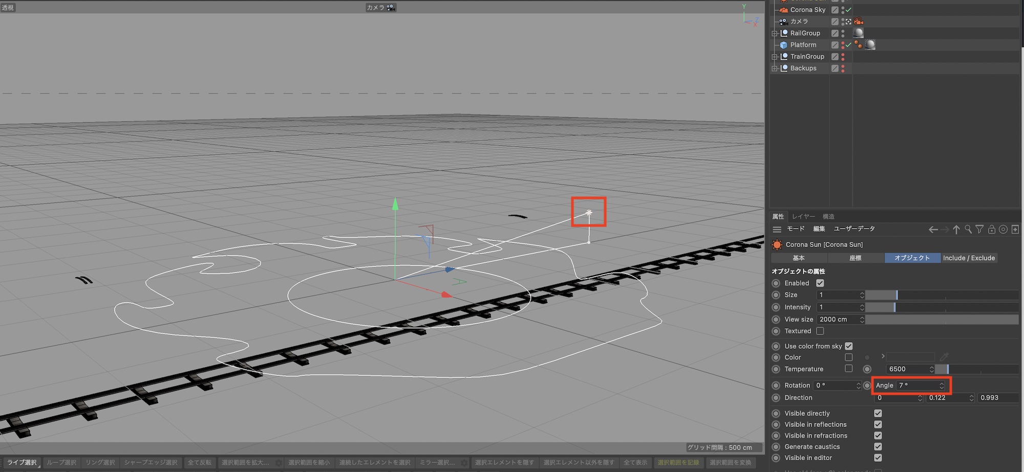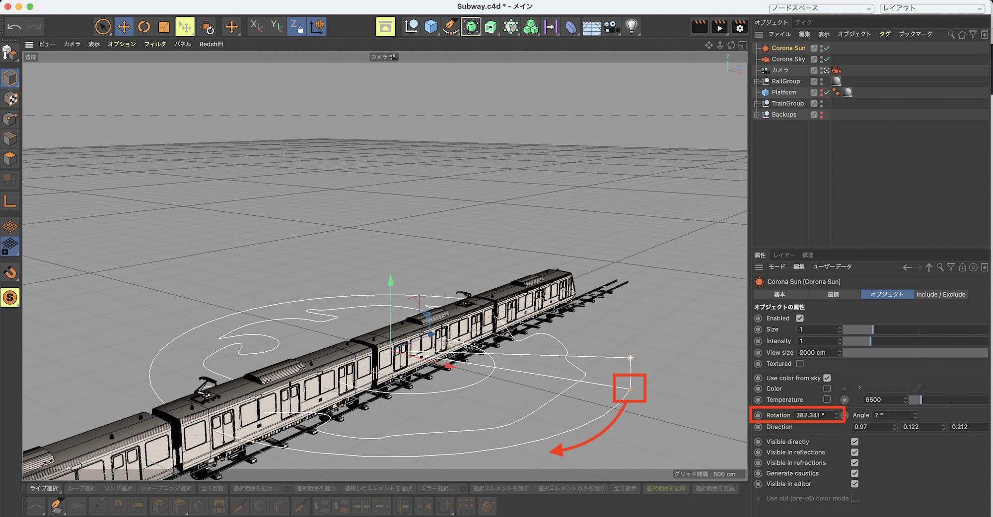 ②の「Rotation」では太陽の向きを変更できます。下の例で電車の右側に動かしたことで、横から太陽光が現れるようになりました。