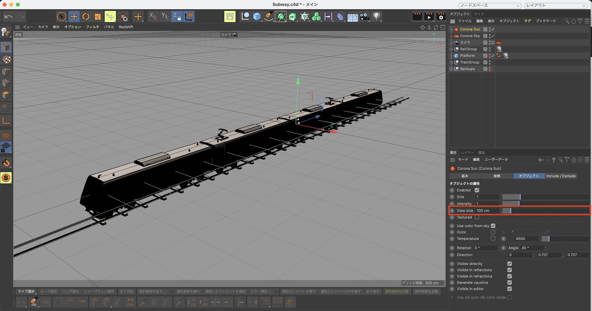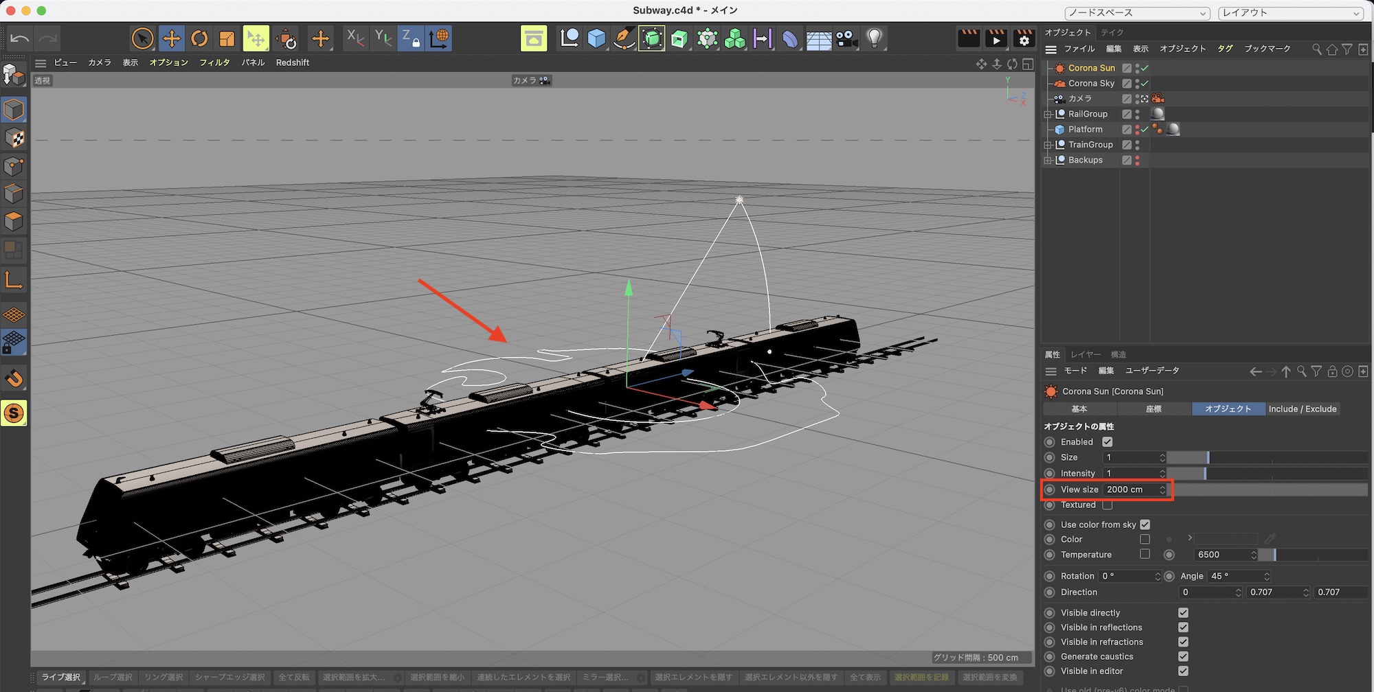 「Corona Sun」オブジェクトを選択して「View size」の数値を変更します。View sizeの数値を変更しても光量の影響は与えないので、オブジェクトより大きいサイズまで広げましょう。