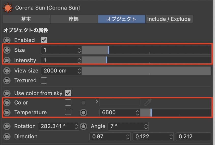 「Size」はオブジェクトのエッジの影に与える強度で、「Intensity」では光量の設定が行なえます。加えて太陽光の色を変えたい場合は「Temperature」からケルビンの数値を入力するか、「Color」からカスタムで色を設定することが出来ます。
