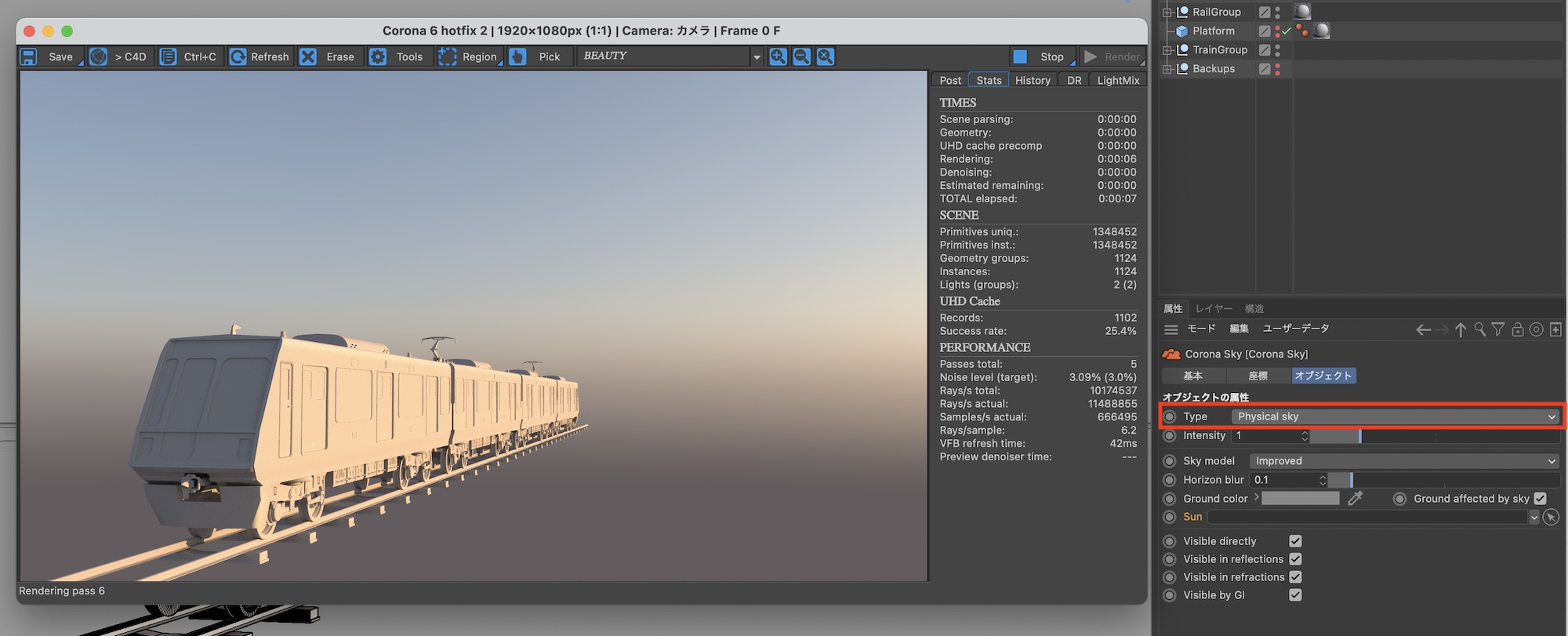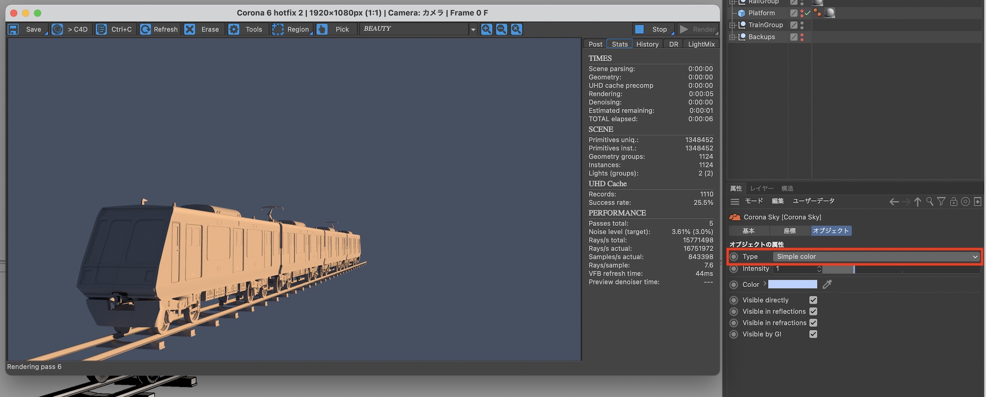 Corona RendererのSkyやSunはCinema 4Dのフィジカルスカイに比べると設定できる項目が少ないですが、比較的リアルな空を表現できるので、Corona Lightオブジェクトと組み合わせるなどして、活用してみてください。