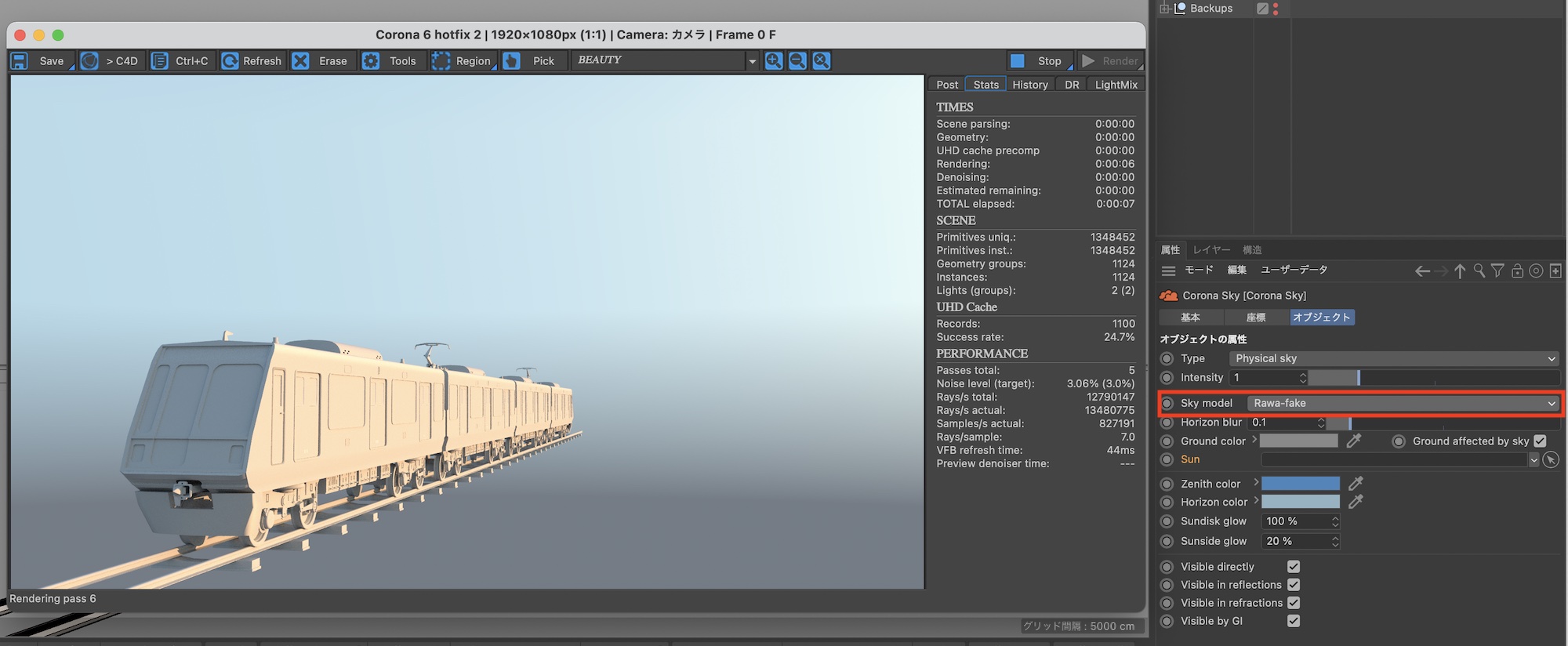 「Physical Sky」選択時に「Sky model」の設定が行なえます。Corona Rendererでは「Improved」、「Rawa-fake」、「Hosek&Wilkie」の3種類が用意されており、演出によって変更すると良いでしょう。