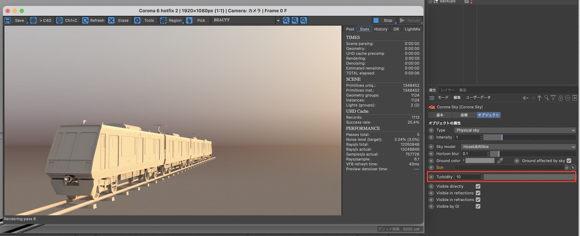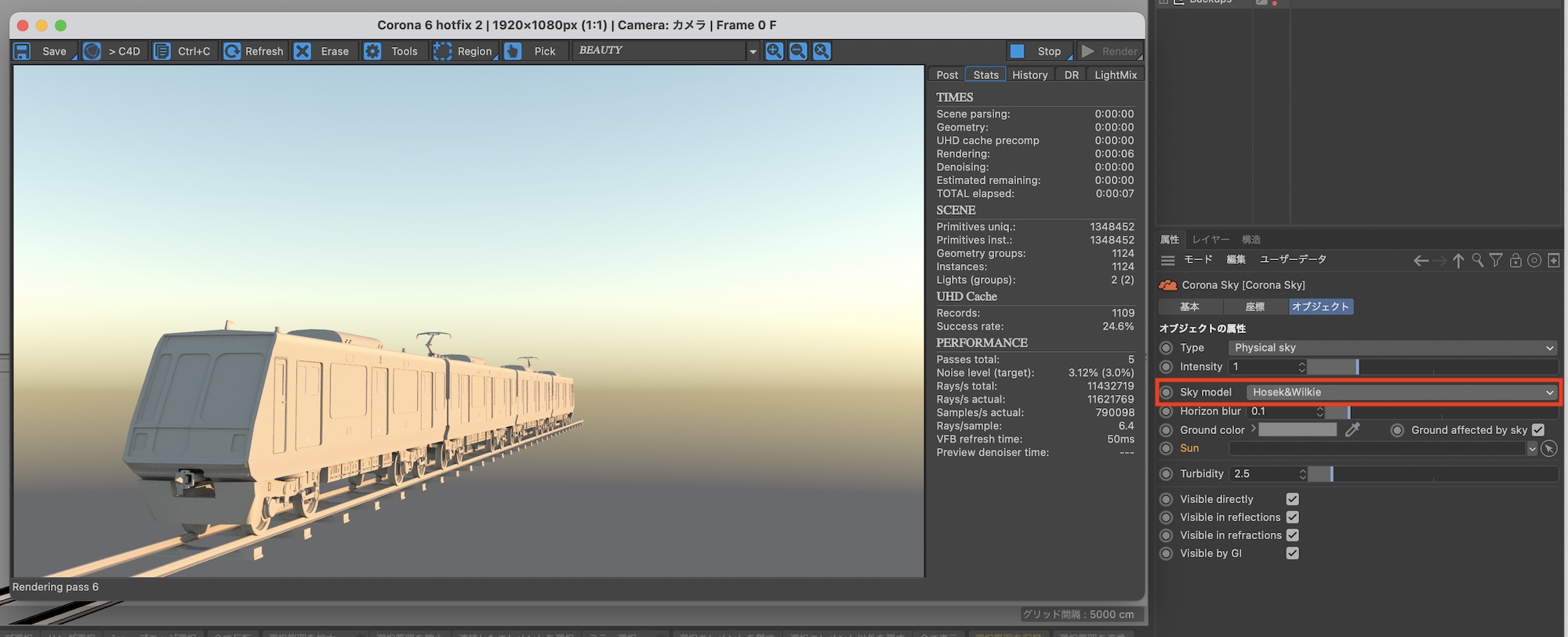 こうすることで正しい露出になりました。次の項目からCorona Sun、Corona Skyの設定を調整して理想の空を作っていきましょう。