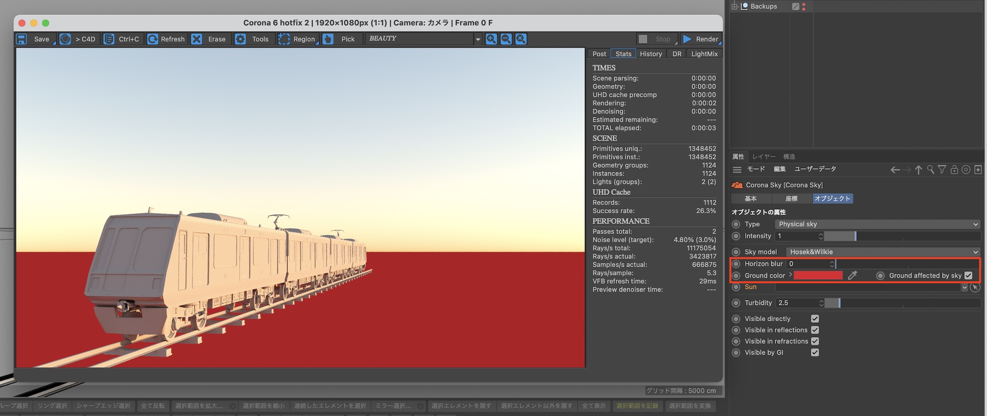 なお、「Horizon blur」から地平線のぼかしの強度の変更を行い、「Ground color」から地面の色の設定を行えます。下の例では「Horizon blur: 0」、「Ground color:赤」にしました。