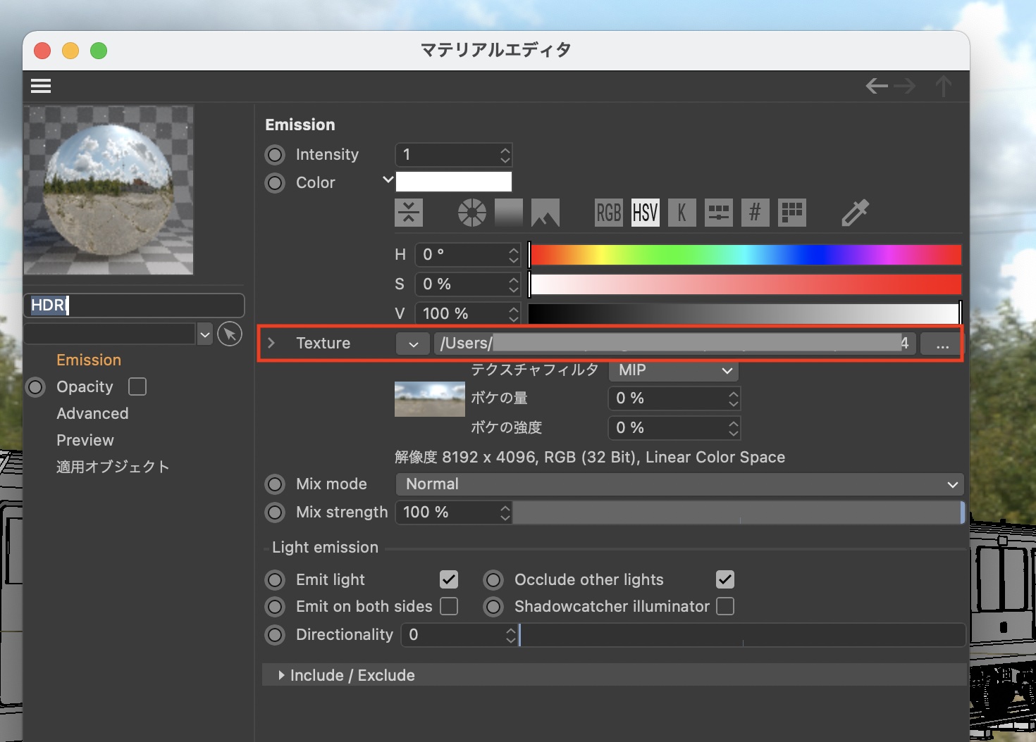 追加したLight Materialをダブルクリックしてマテリアルエディタを開き、「Emisson」の項目にある「Texture」から追加したいHDRIの画像を選択します。