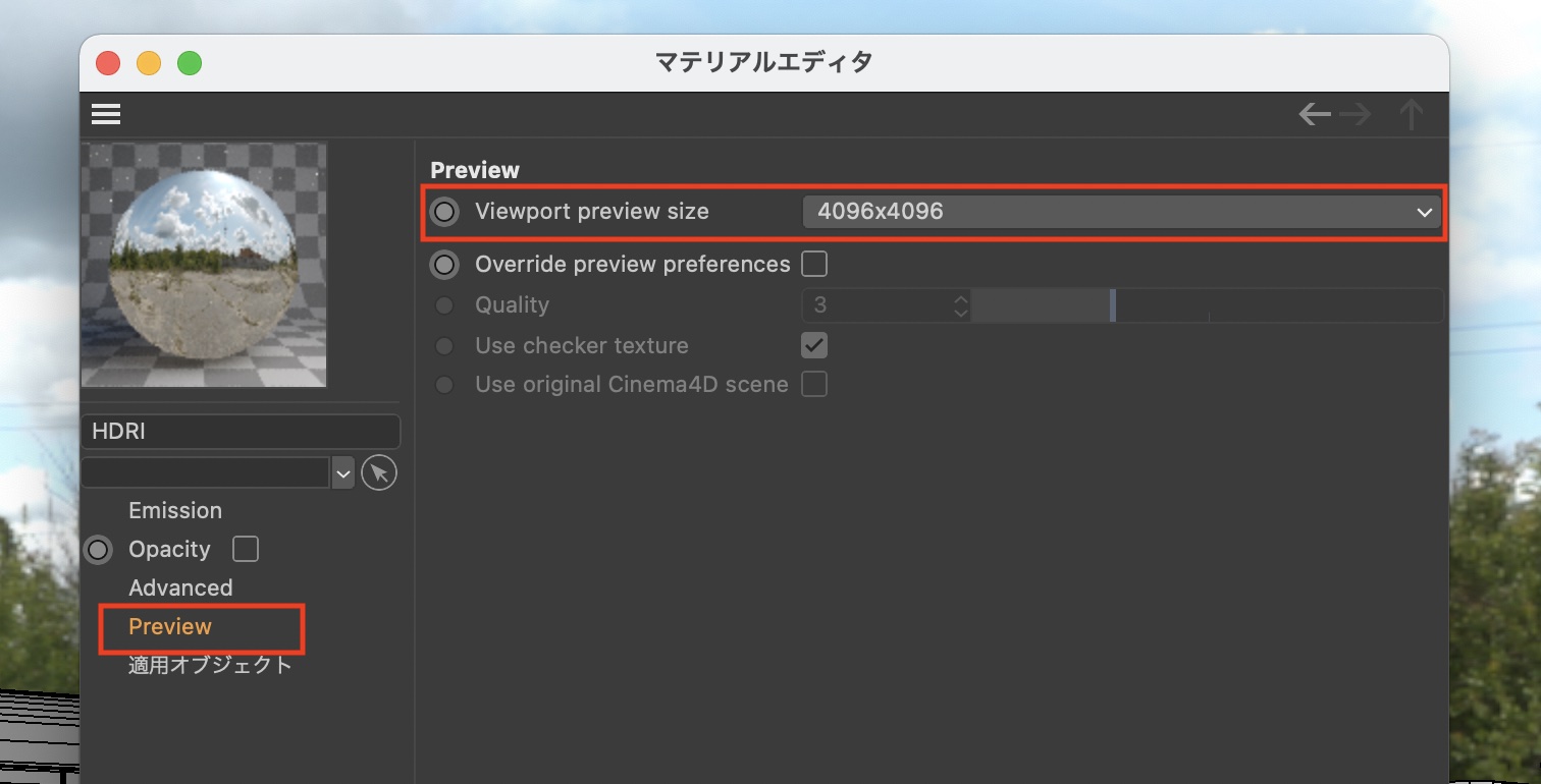 HDRI画像の解像度(テクスチャプレビューサイズ)を変更したい場合はマテリアルエディタの「Preview」の項目にある「Viewport preview size」から行うことが出来ます。