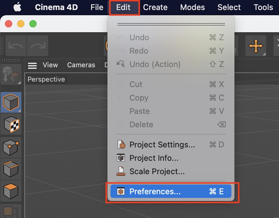 Cinema 4Dのインストール後は言語が英語になっています。上部メニューの「Edit(編集)」から「一般設定(Preference)」をクリックします。macOSの場合は「Cinema 4D」の項目から選択できます。