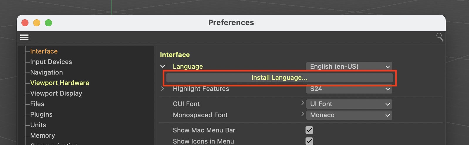 「Interface(インターフェイス)」の項目にある「Language(言語)」の三角アイコンをクリックして「Install Language(言語をインストール)」をクリックしましょう。
