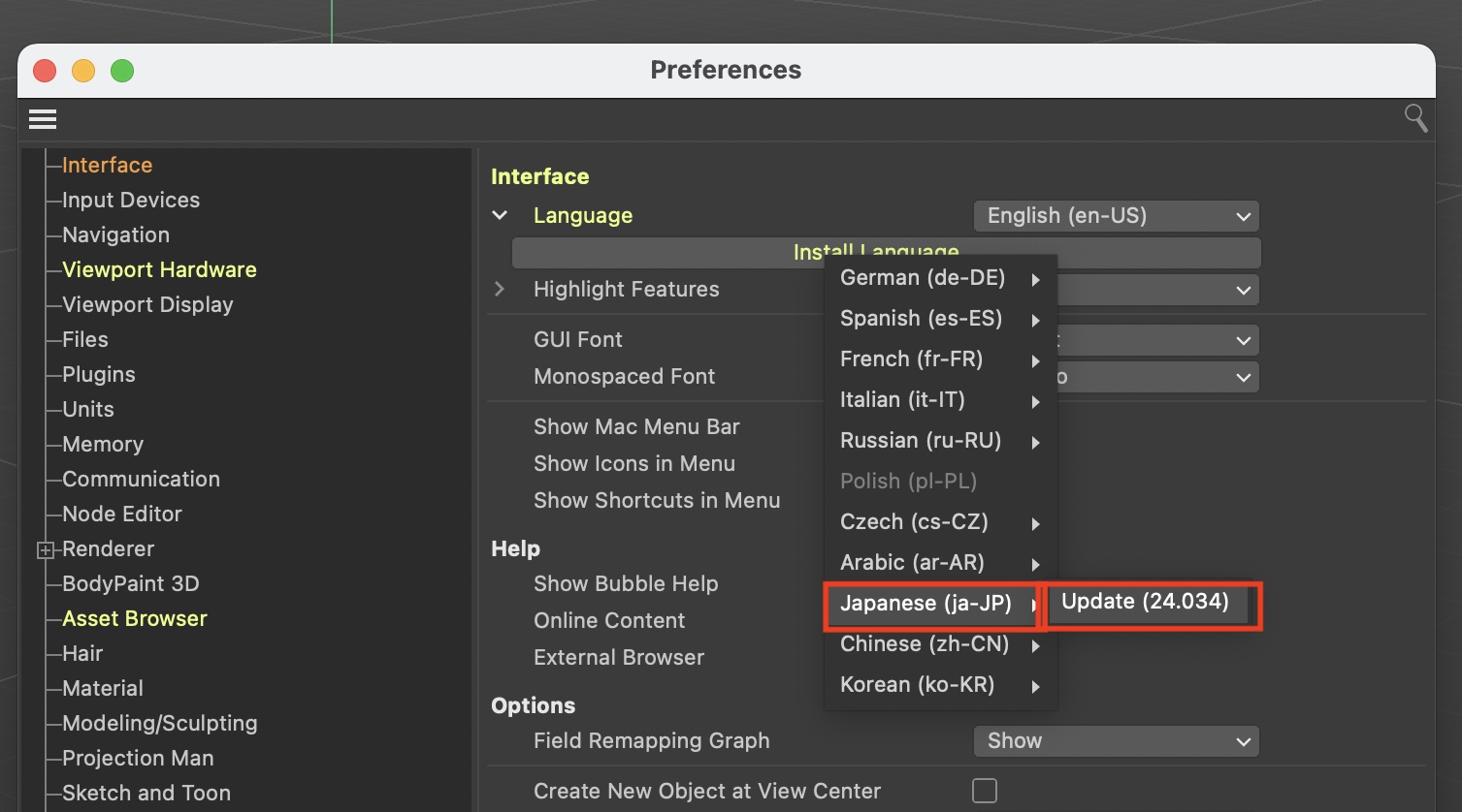 Cinema 4D R24以降で日本語などの多言語のインストールと切り替えの設定方法