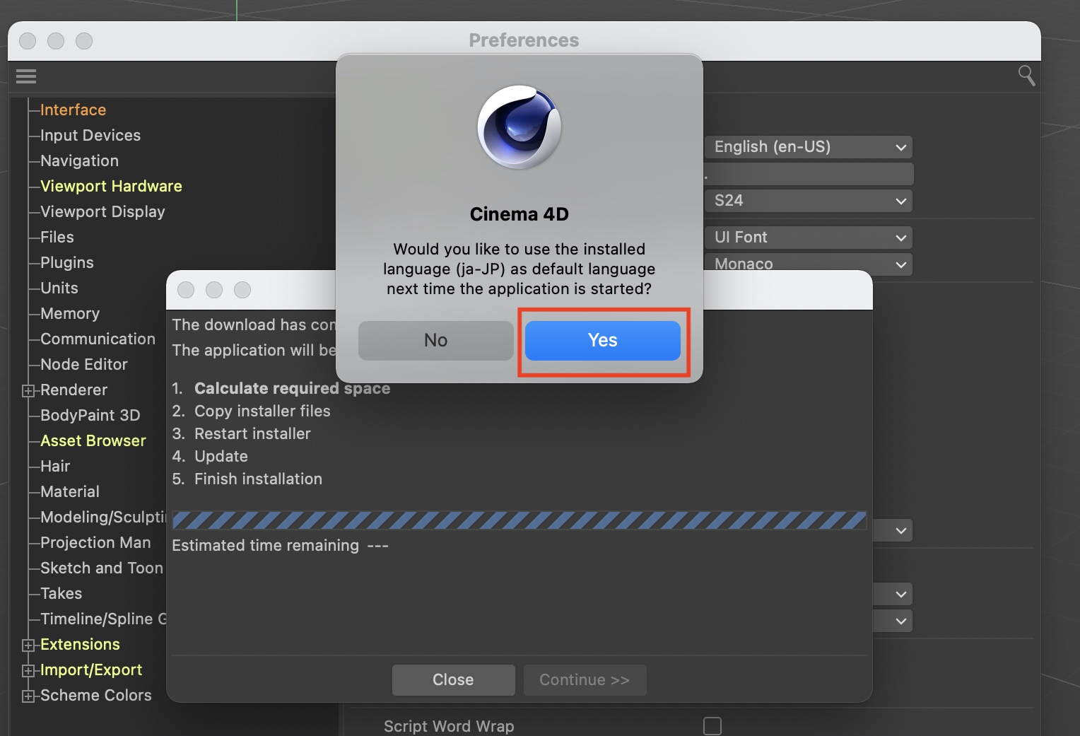 Maxon Online Updaterが起動するのでダウンロードとインストールを進めます。「Would you like to use the..」のウィンドウでは次回起動時にダウンロードした言語に設定するかの確認になるので、「Yes」をクリックしましょう。