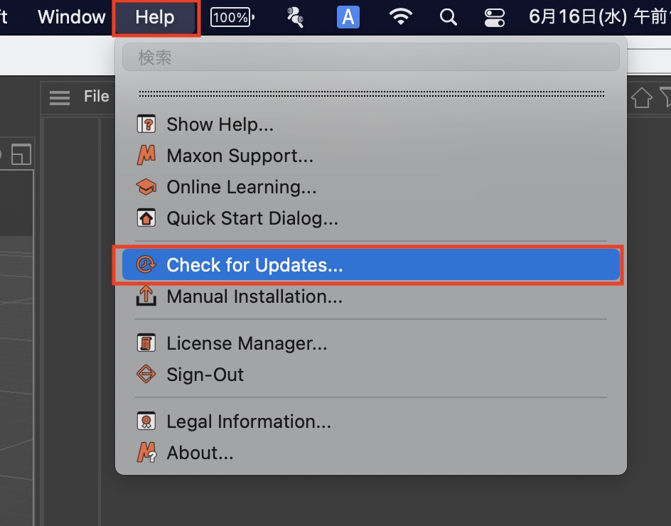 S24以前のバージョンで言語パックをインストールする場合は上部メニューの「Help(ヘルプ)」の項目から「Check for Updates(アップデートを確認する)」をクリックし、Maxon Online Updaterを起動します。