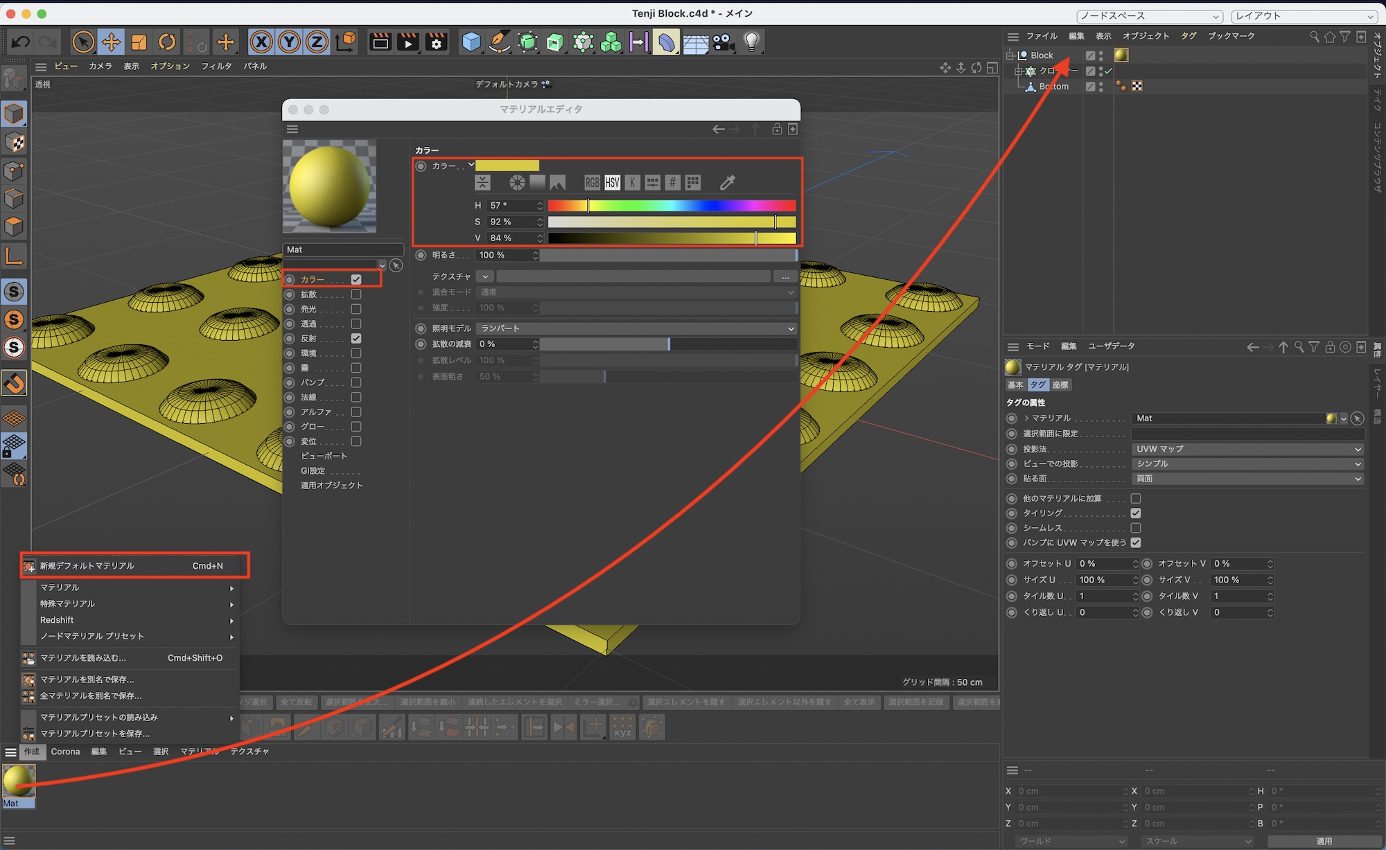 新しくマテリアルを作成し、「カラー」の項目から点字ブロックの黄色を作成して、「Block」のオブジェクトにドラッグ・アンド・ドロップしてマテリアルを反映させます。