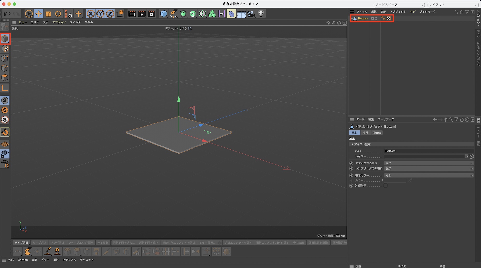 Cinema 4Dで立方体を追加し、モデルモードにした上で点字ブロックの底の部分になるようにY軸のサイズを変更します。