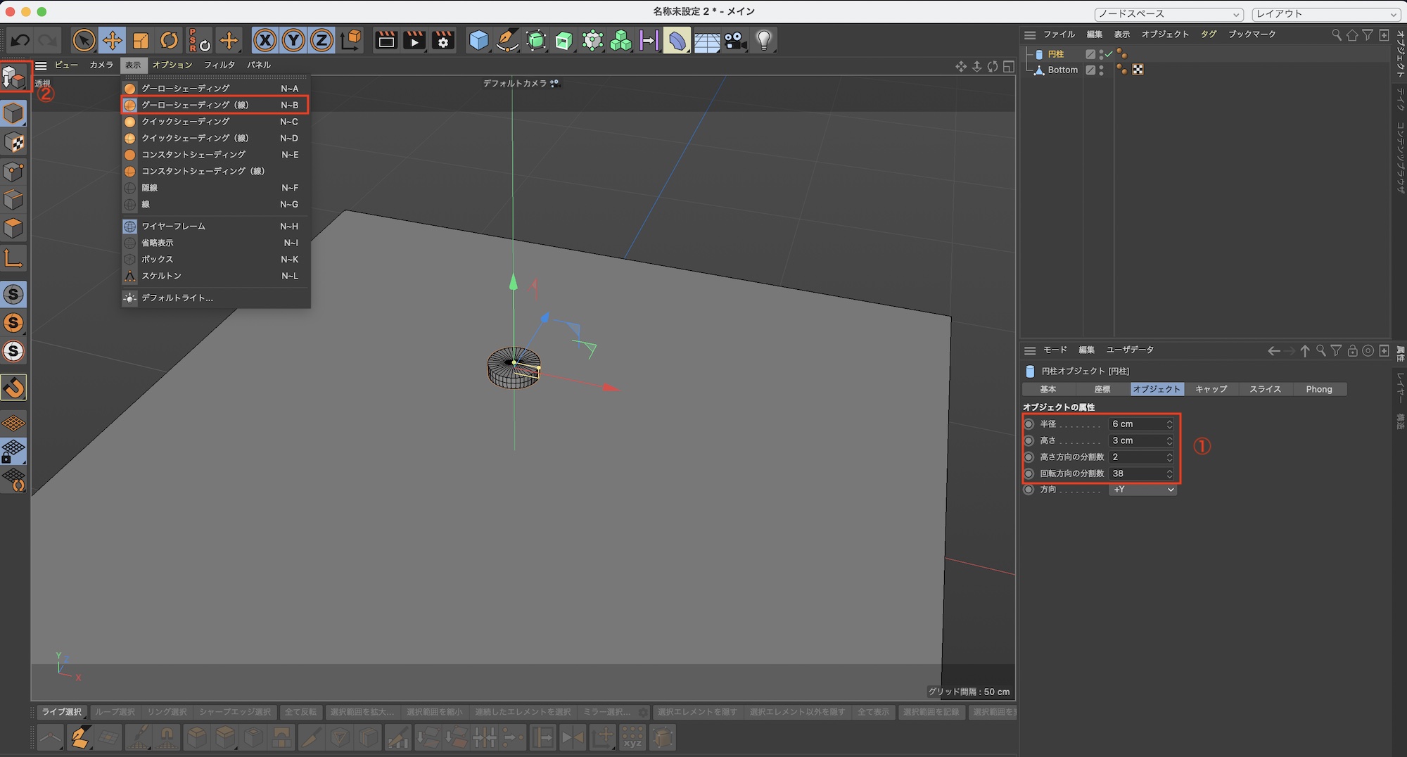 筆者の場合はひとまず「半径:6cm」、「高さ:3cm」、「高さの方向の分割数:2」、「回転方向の分割数:38」にした後で「編集可能にする」をクリックしましょう。また、モデリングがやりやすいようにビューポートの「表示」から「グーローシェーディング(線)」にしておくこともおすすめします。