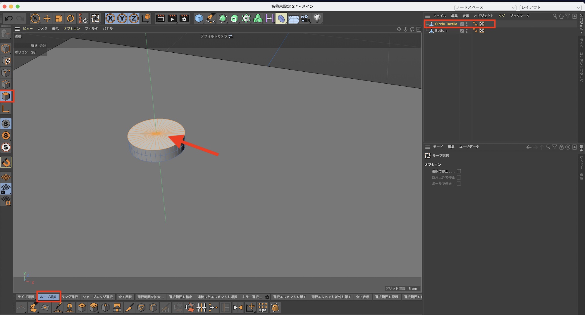 「Circle Tactile」を選択してポリゴンモードにして、「ループ選択」から円柱の上のポリゴンを全て選択します。