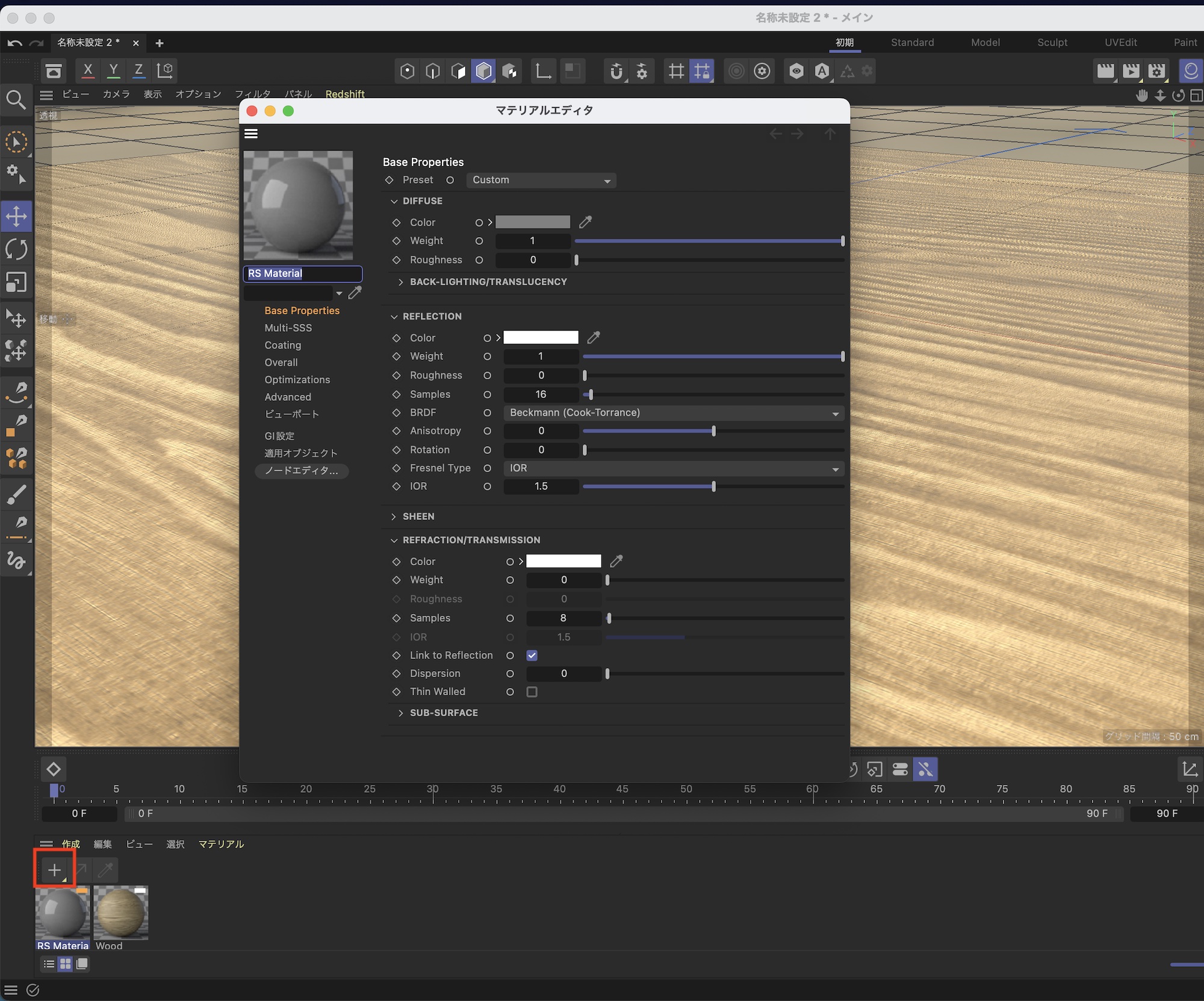 新しい標準マテリアル(Redshift Standard Material)を利用するには「+」アイコンを長くクリックし、「Material」の中にある「Standard Material」をクリックすることで利用できます。