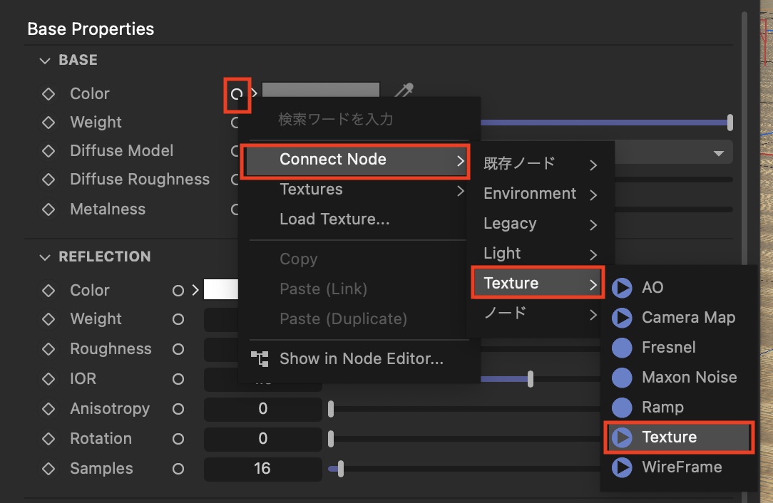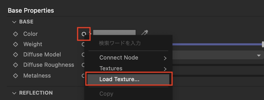 JPEGやPNGのPBRテクスチャはノードエディタで操作することも可能ですが、「Color」にある丸いアイコンをクリックして「Load Texture」または「Connect Node」、「Texture」、「Texture」から追加できます。