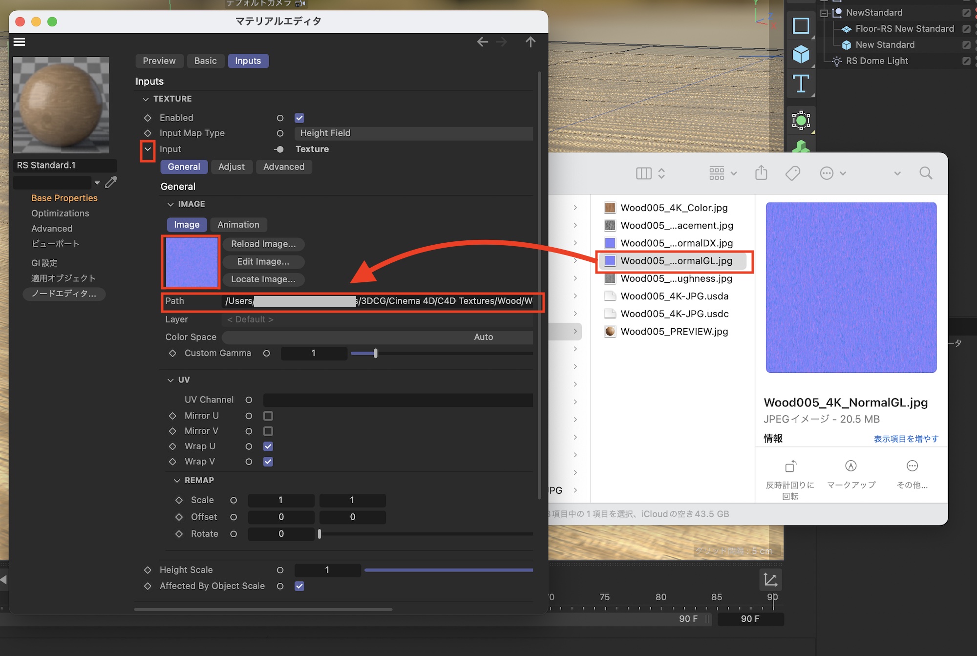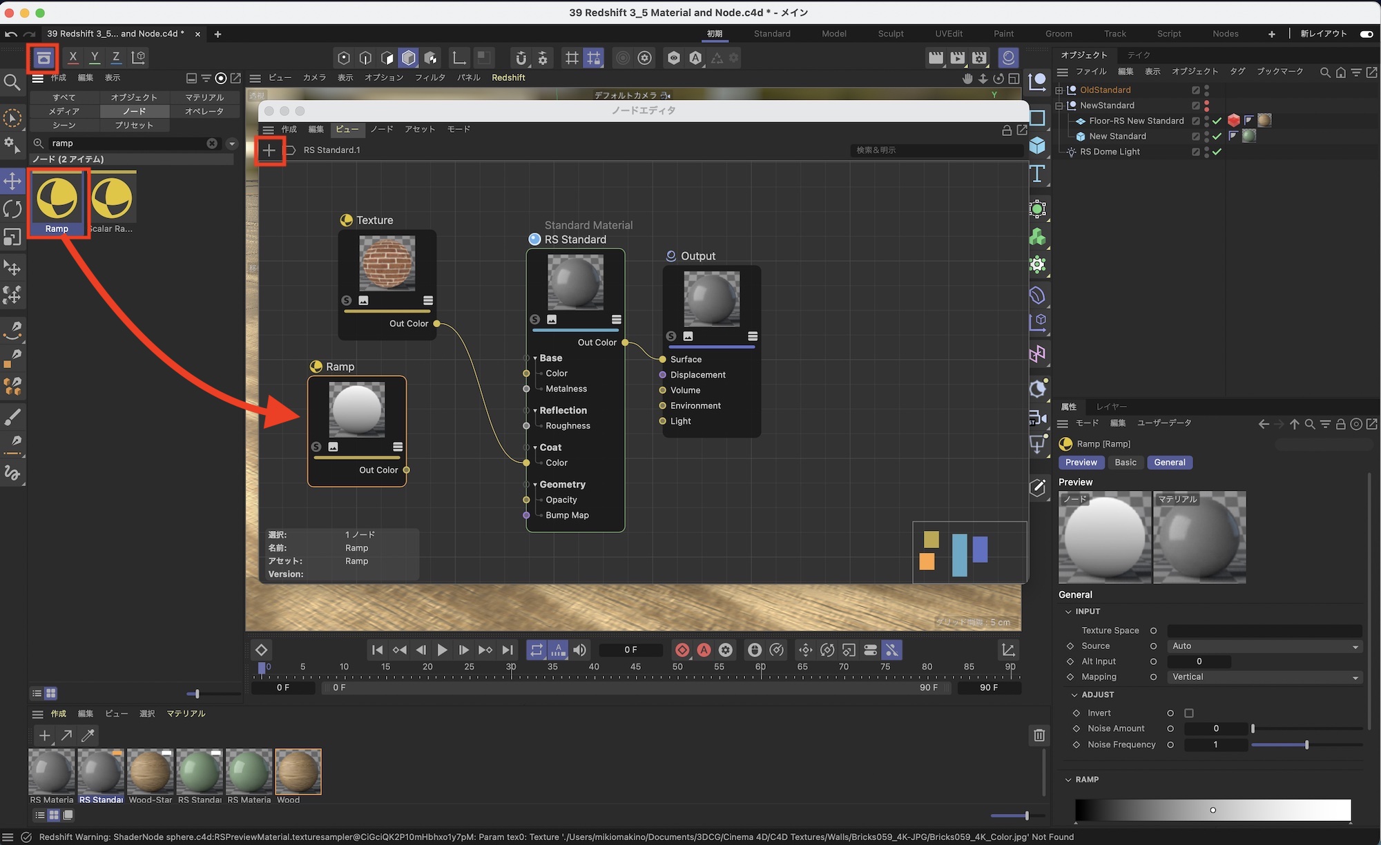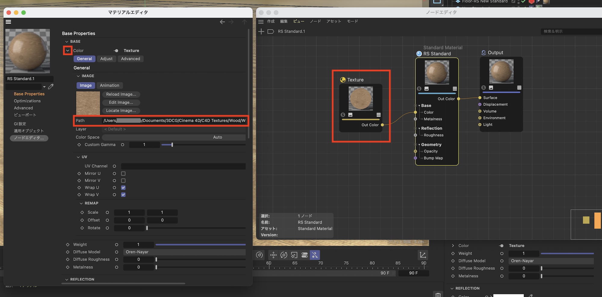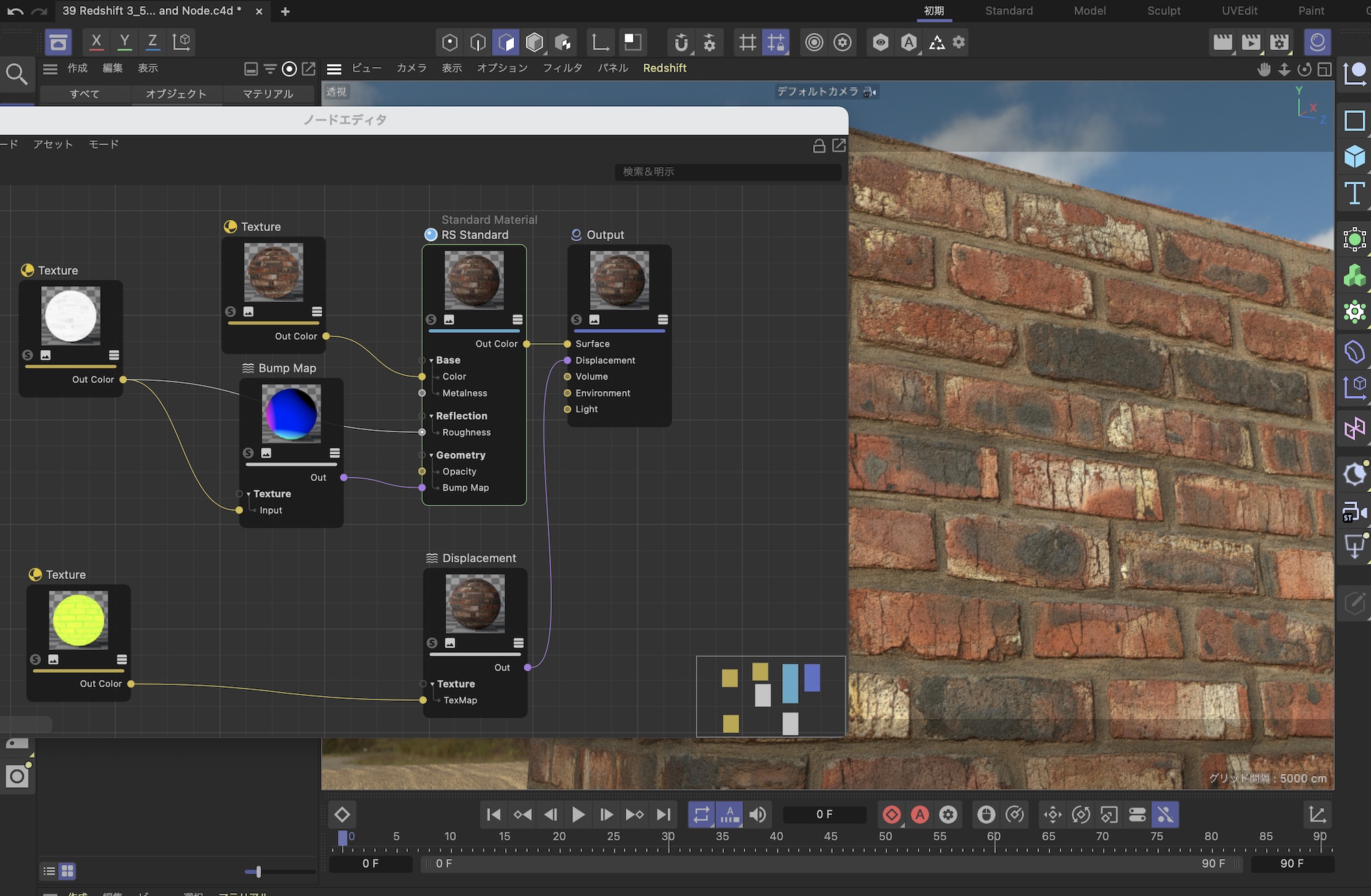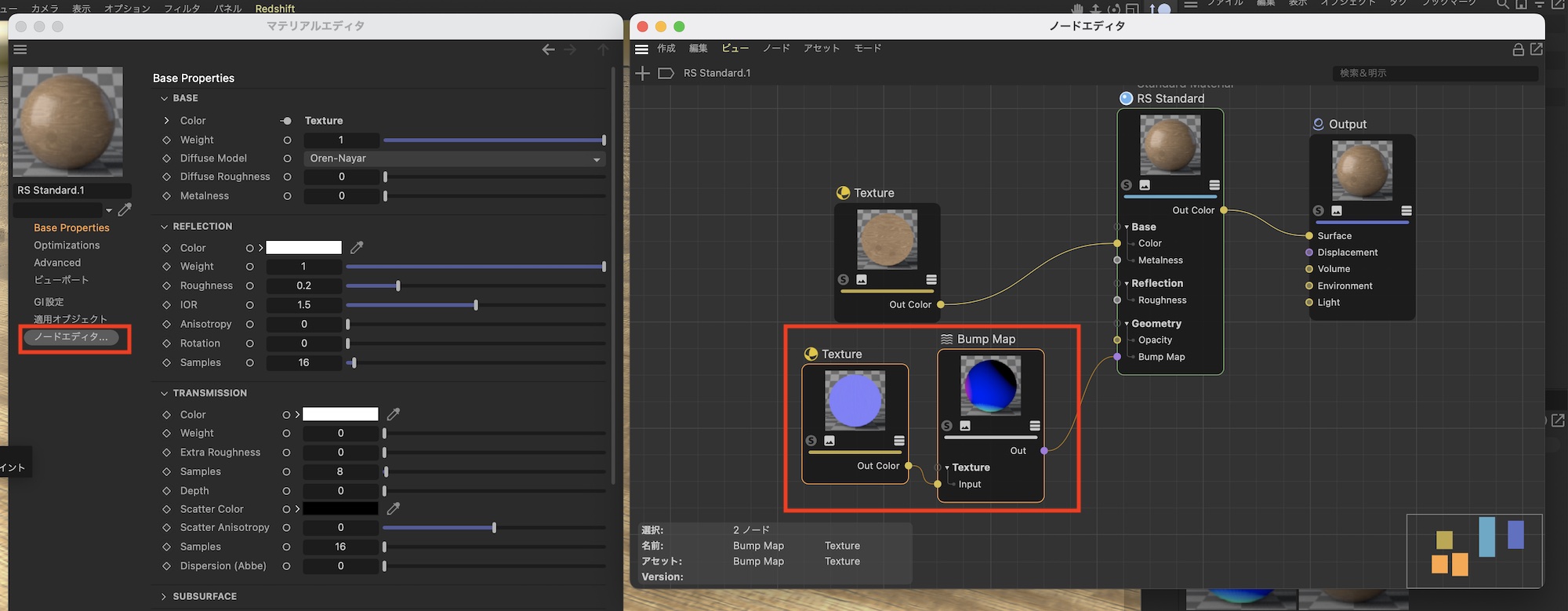 ノードエディタでマテリアルの構造を確認してみると、自動でBump MapとTextureのノードが追加されており、問題なくバンプマップがRSマテリアルと接続されています。