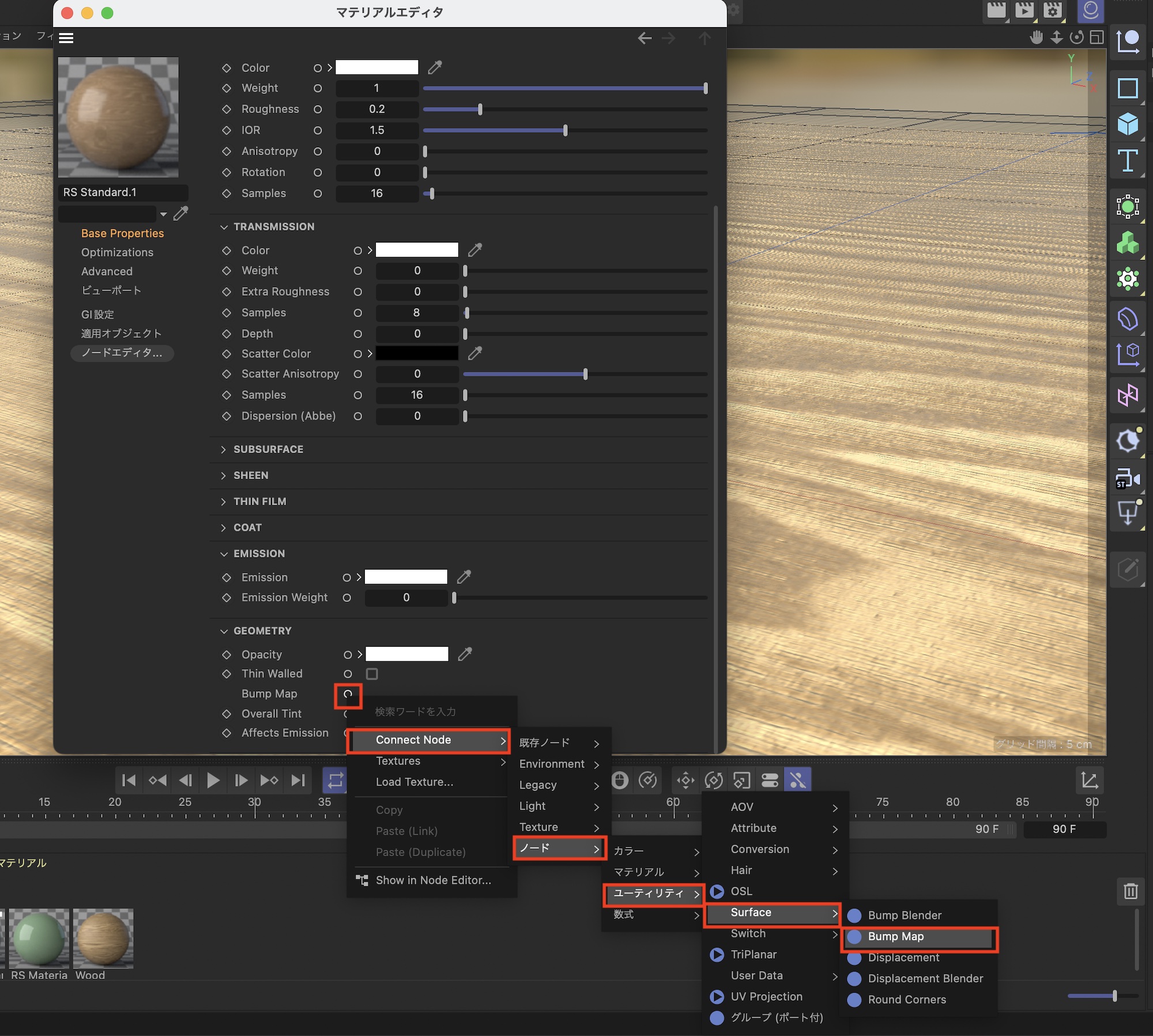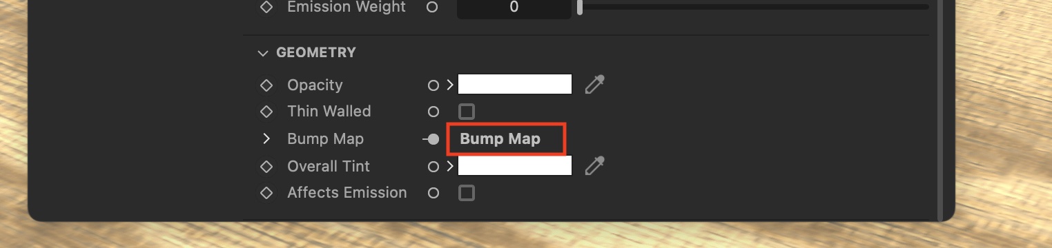 Bump Mapとバンプに使用するテクスチャを追加する場合は、マテリアルエディタの「Geometry」の項目にある「Bump Map」の丸いアイコンをクリックし、「Connect Node」、「ノード」、「ユーティリティ」、「Surface」、「Bump Map」をクリックします。