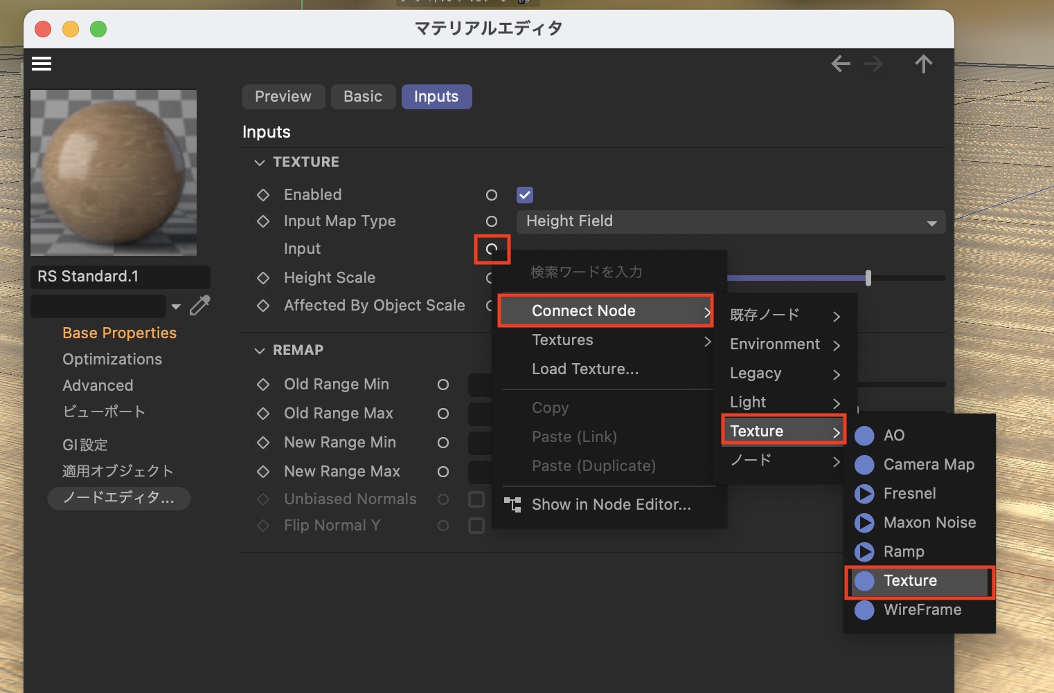 「Bump Map」の文字をクリックし、「Inputs」の「Input」の丸いアイコンをクリックして、「Connect Node」、「Texture」、「Texture」を選択します。