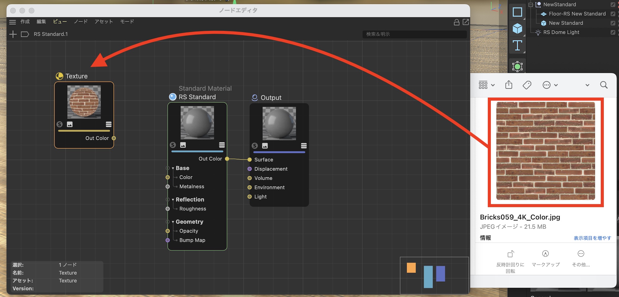 Redshiftのノードの操作は基本的に前のバージョンとあまり変わりません。テクスチャの場合はJPEGやPNGの画像ファイルをノードエディタにドラッグ・アンド・ドロップして追加できます。