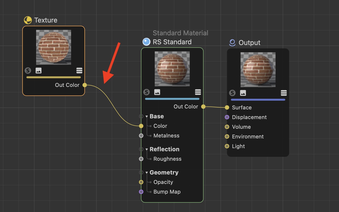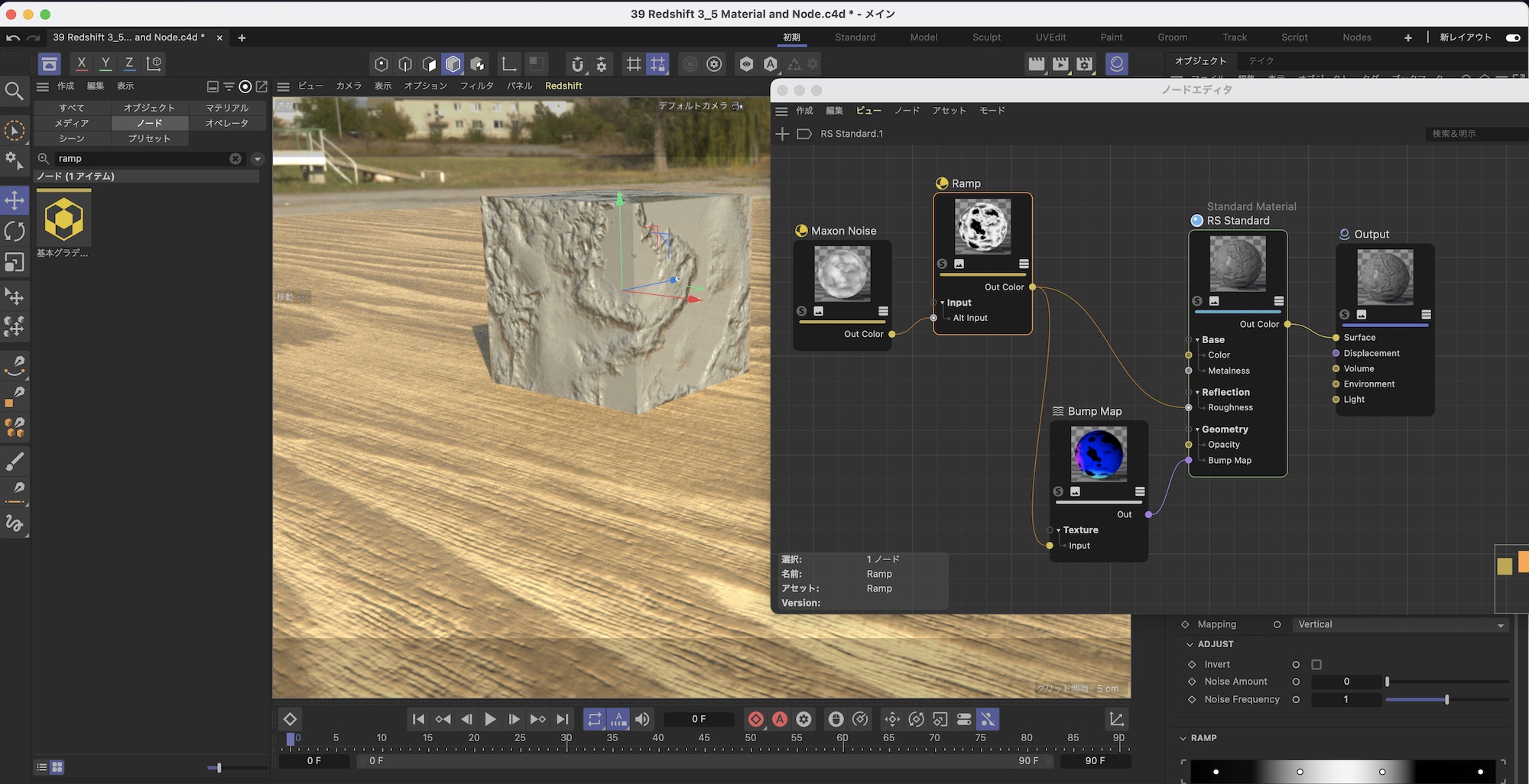 上の例はMaxon NoiseとRampのノードを追加し、RS MaterialのRoughnessとBump Mapに接続させて凹凸を表現したもの。