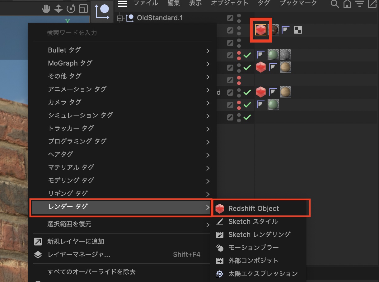 RedshiftのDisplacementを使用する際は、オブジェクトにRedshift Objectタグを追加する必要があります。タグはオブジェクトマネージャで右クリックして「レンダータグ」から見つけることが出来ます。