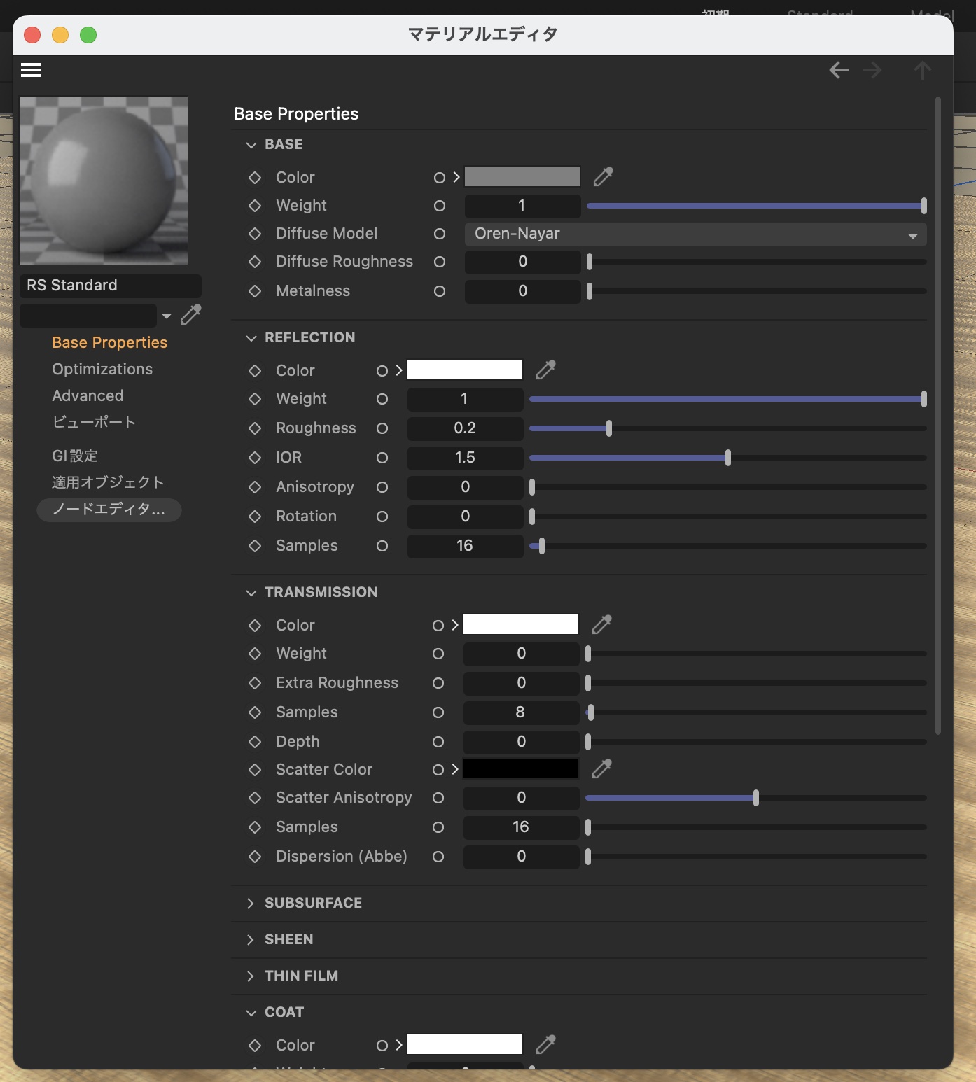 Redshift Standard MaterialはこれまでのRedshift Materialと同じように見えますが、Standard Materialはいくつか新しい項目が追加され、プリセットが用意されていないほか、Redshift Materialで別の項目にあったSSSやCoatingがStandard Materialでは「Base Properties」に集約されています。