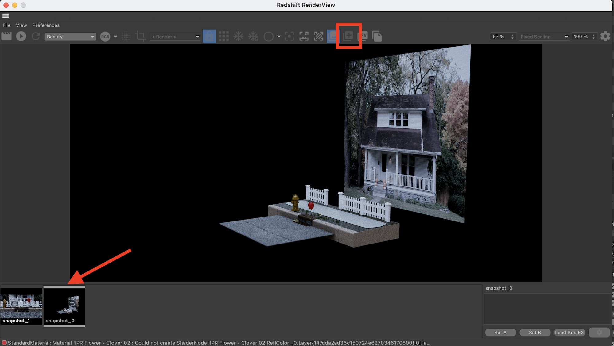 レンダリングされたフレームはスナップショットとして一時的に保存することができます。スナップショットしたいフレームをレンダリングし、上部ツールバーの+アイコンをクリックするとシーンが書き出されます。