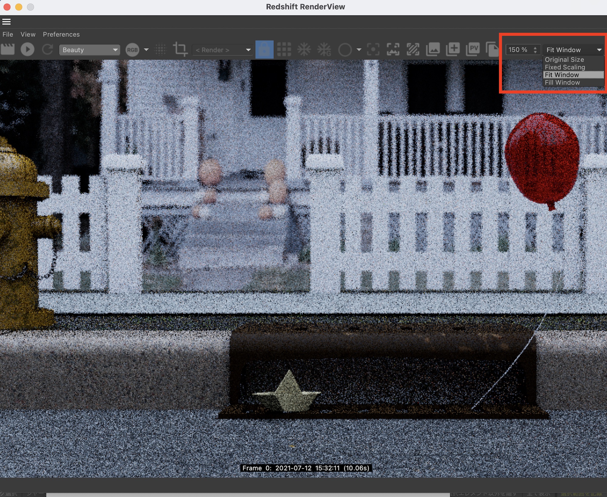 レンダリングされたフレームのプレビューサイズを変更したい場合は「%」の項目から数値を入力するかドロップダウンメニューから「Fit Window(ウィンドウに合わせる)」などを選んで切り替えると良いでしょう。
