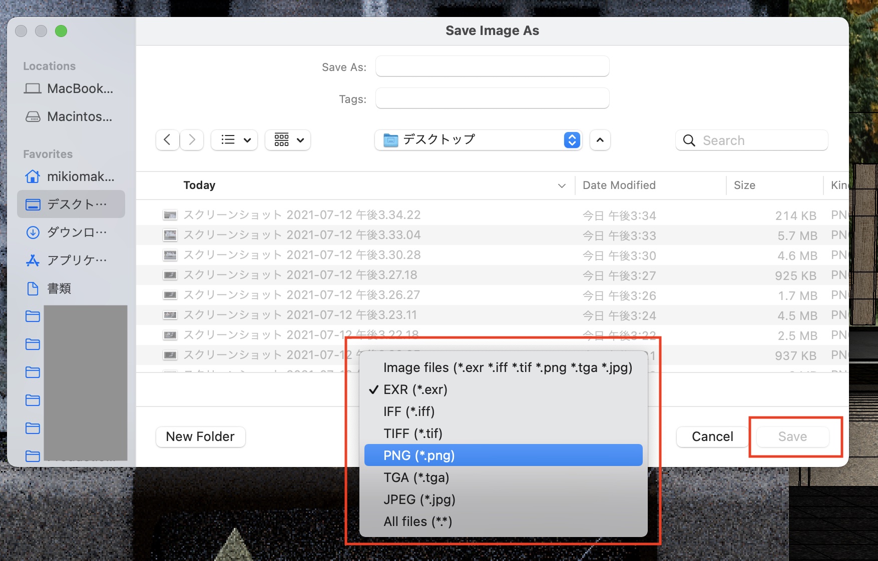 Finderなどのブラウザが開くので、保存先とフォーマットを選択して「Save」をクリックすれば保存できます。