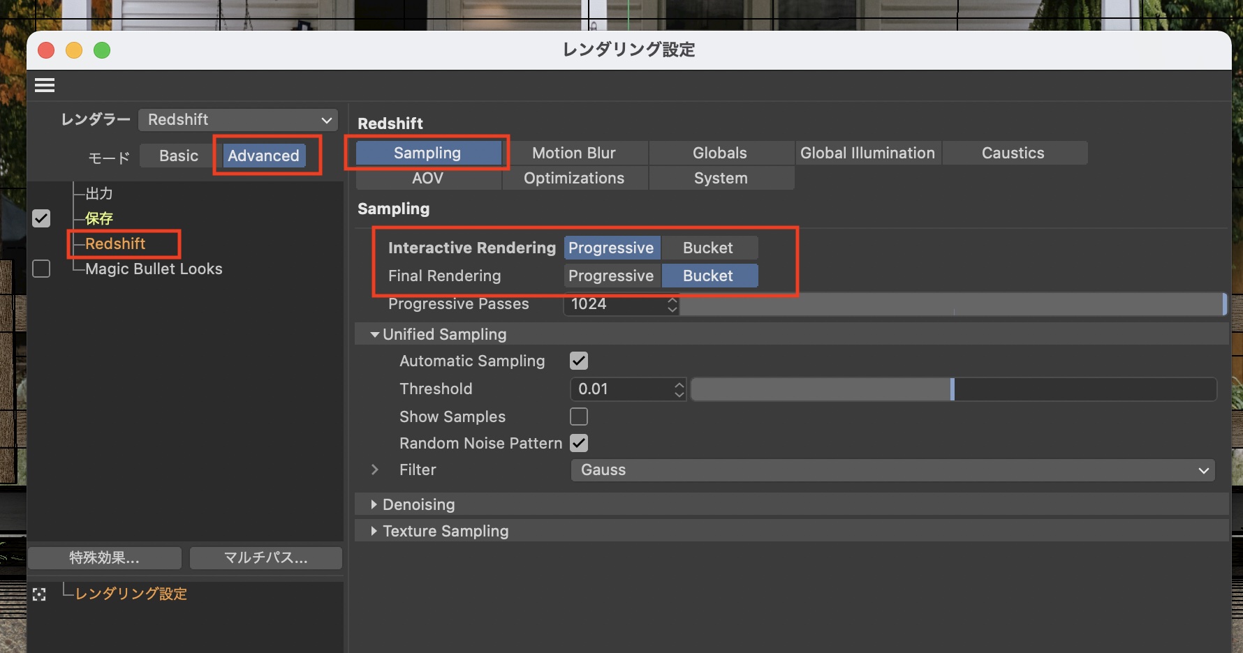 RedshiftではProgressiveをプレビュー用、Bucketを最終レンダリング用としてデフォルトで設定してありますが、レンダリングモードを変更したい場合はレンダリング設定の「Redshift」の項目を開き、「モード:Advanced」にします。