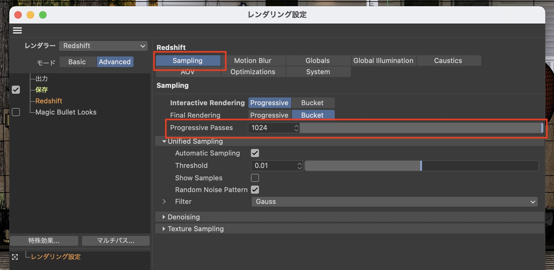 Redshiftの項目ではよりノイズを軽減するため、「Sampling」の項目にある「Progressive Passes」からパス数を指定します。筆者の場合は「1024」にしていますが、数値が高ければ高いほどレンダリング時間が長くなるのでシーンに合せて調整しましょう。