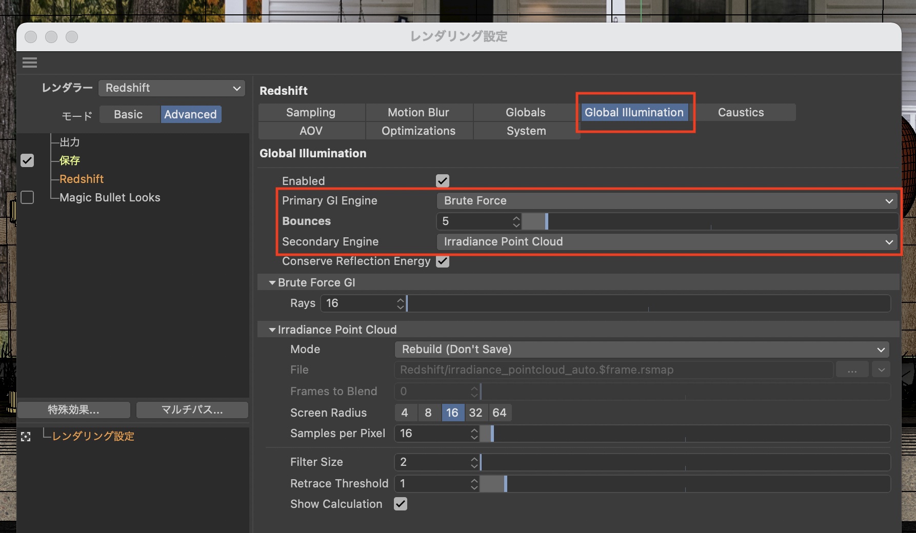 上の画像のようにプライマリを「Brute Force」、バウンス数を「5」、セカンダリを「Irradiance Point Cloud」を選ぶのが良いかもしれません。